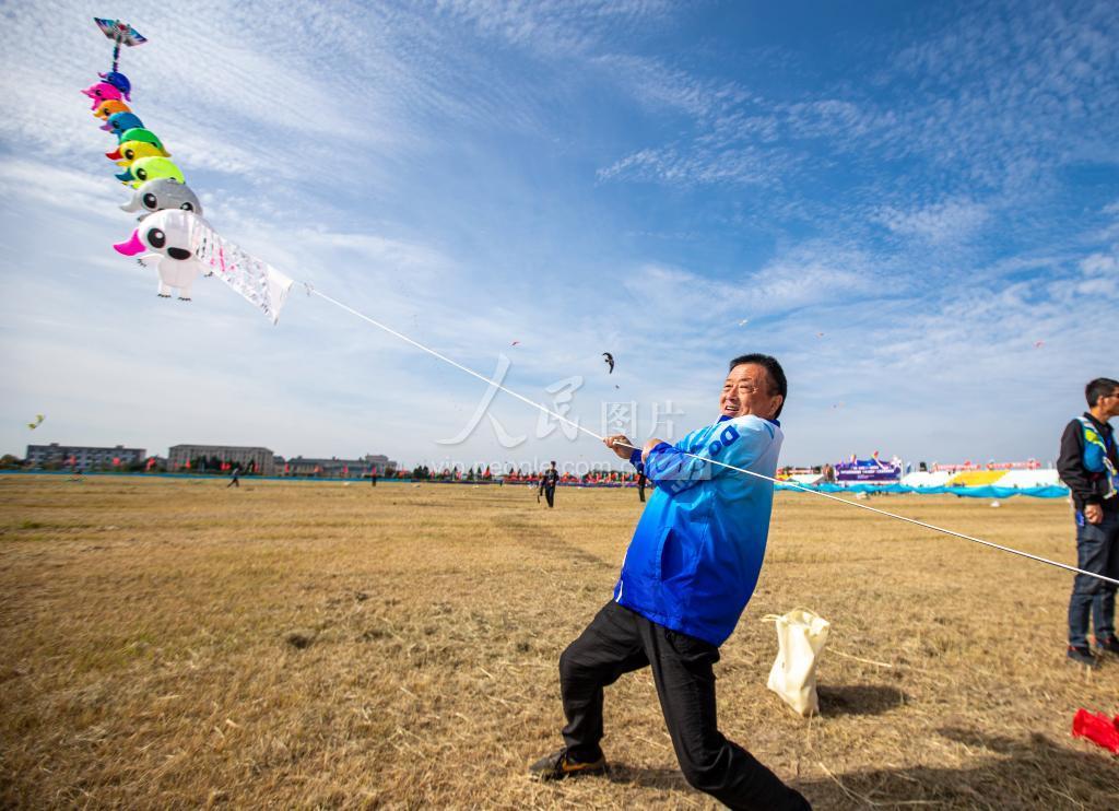 2020年10月18日,选手在江苏省如东县的小洋口风筝放飞基地举行的“2020年全国风筝邀请赛”上放风筝。
