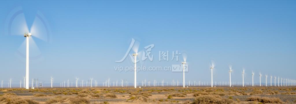 2020年10月15日,甘肃省瓜州县瓜州风电场,庞大的风车群在戈壁滩上运行转动,场面尤为壮观。
