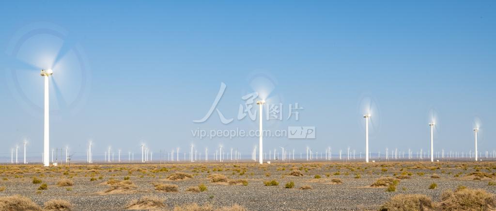 2020年10月15日,甘肃省瓜州县瓜州风电场,庞大的风车群在戈壁滩上运行转动,场面尤为壮观。