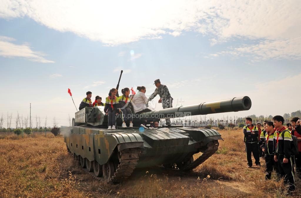 2020年10月17日,安徽省淮北市古城路小学的学生们在国防科技园内参观体验国防武器装备。