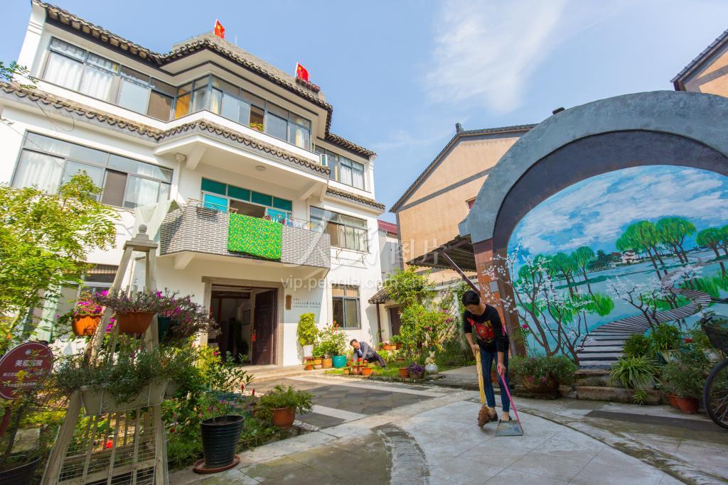 2020年10月17日,在江苏吴江七都镇开弦弓村,村民周小芳在庭院中打扫卫生。费孝通先生调研该村时曾先后4次居住在她家,目前她开办了拥有7间住房的民宿。