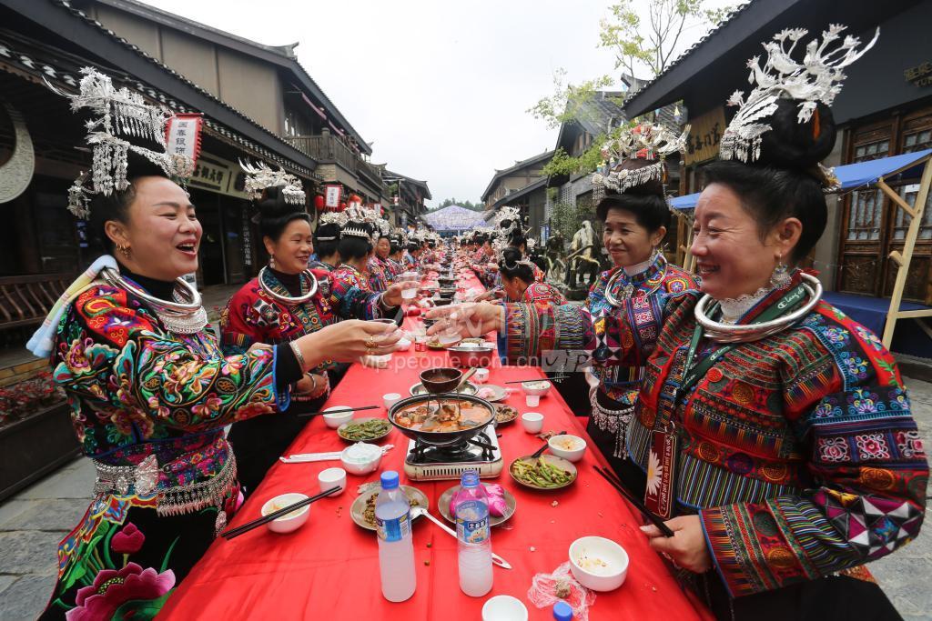 2020年10月18日,贵州省黔东南苗族侗族自治州丹寨县万达小镇举办苗族吃新节体验活动,上千名苗族同胞与游客现场体验苗族传统吃新节民俗,共同品尝苗族长桌宴,大家在欢声笑语中乐享金秋。