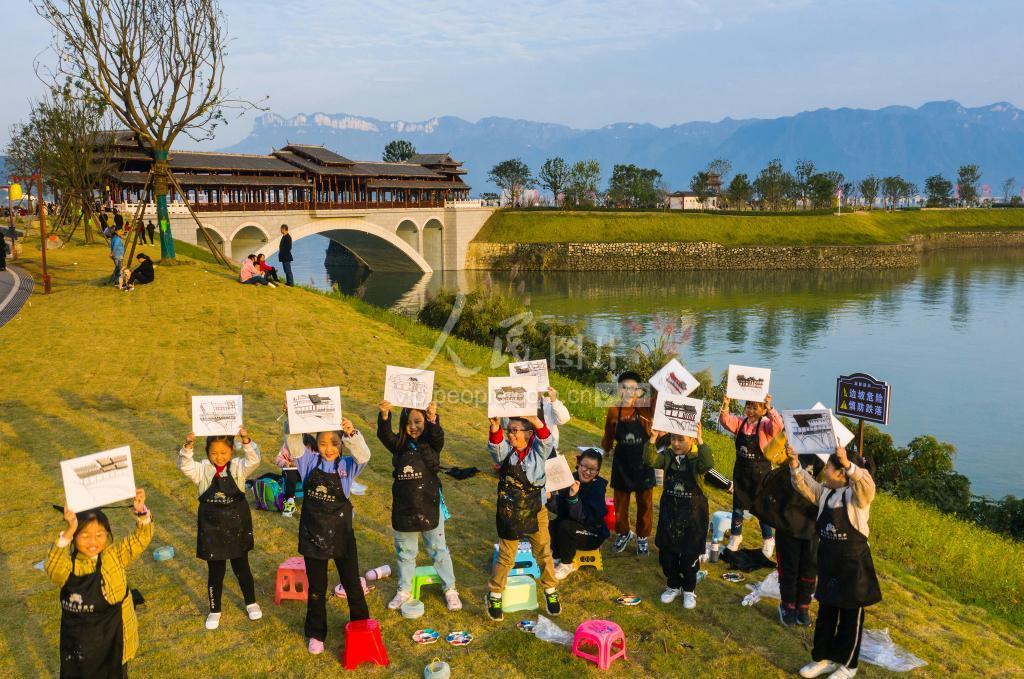 2020年10月18日,三峡库区湖北省宜昌市秭归县木鱼岛休闲公园一群学习绘画的小孩子展示他们的写生习作。