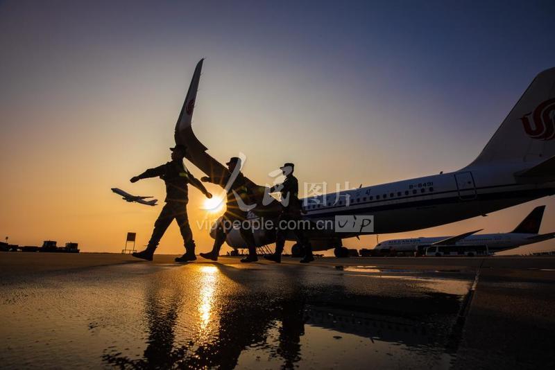 2020年10月18日,上海浦东国际机场,执勤武警战士迎着朝阳列队行进。