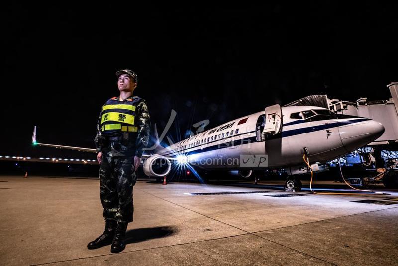 2020年10月17日,上海浦东国际机场,执勤武警战士以昂扬的姿态守护夜色下的机场。