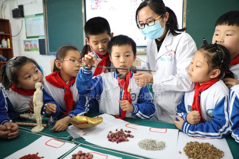 2020年10月20日,在山东省东营市东营区实验小学,小学生们在东营中医医院医生的指导下学习中医知识。 当日,东营市东营区实验小学联合东营中医医院开展“中医文化进校园活动”,学生们在专业医生的指导下识别中药材、了解穴位针灸等中医药知识,让学生们对中医药文化有了初步认识,感受中国传统医药文化的魅力,迎接10月22日“世界传统医药日”的到来。