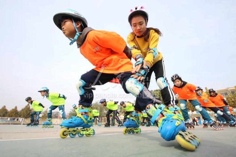10月20日,轮滑教练正在河北省邯郸市永年区第四中学校园操场内辅导学生训练。
