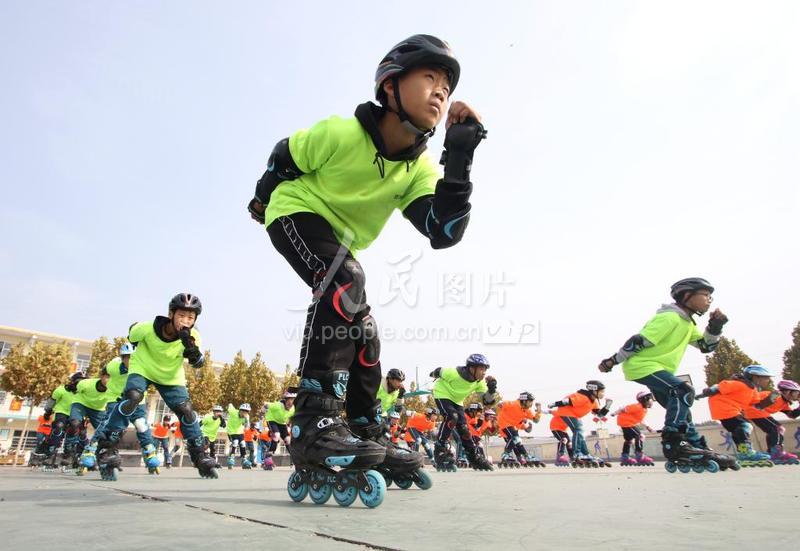 10月20日,学生们正在河北省邯郸市永年区第四中学校园操场内练习轮滑。