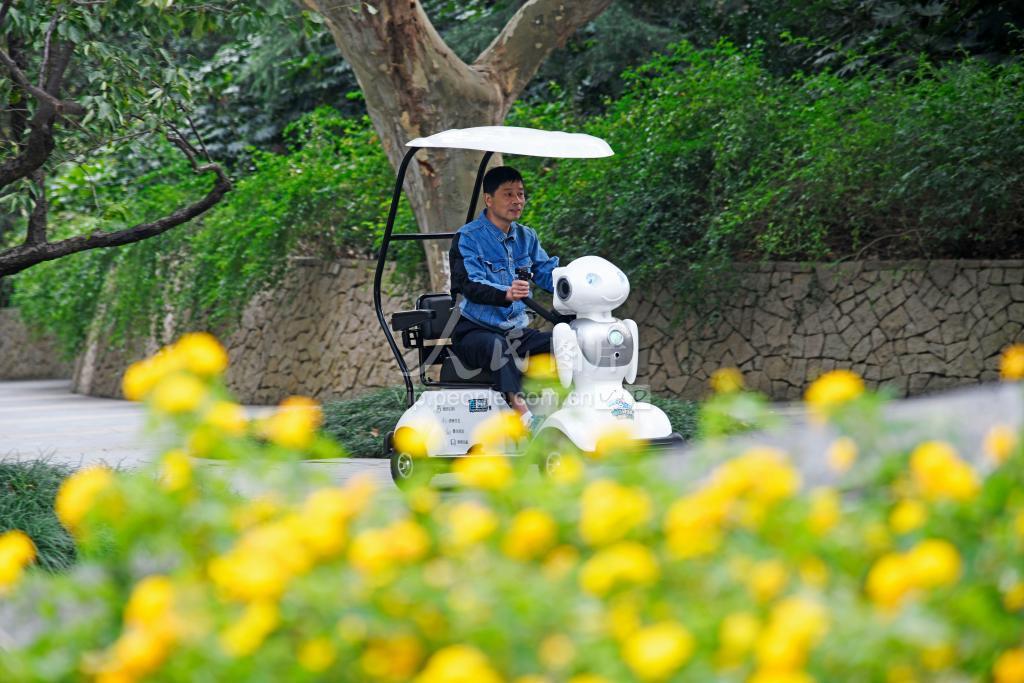 2020年10月20日,游客正在常州红梅公园体验智能伴游机器人。据了解,这款伴游机器人具有语音播报、视频宣传、导游等功能,可定点讲解公园的人文典故、历史文化,并配备超声雷达检测等安全系统。在遇到水坑、路障、台阶等复杂路况会进行语音提示预警,规避危险,大大提升游客旅行安全体验和提高公园服务质量。