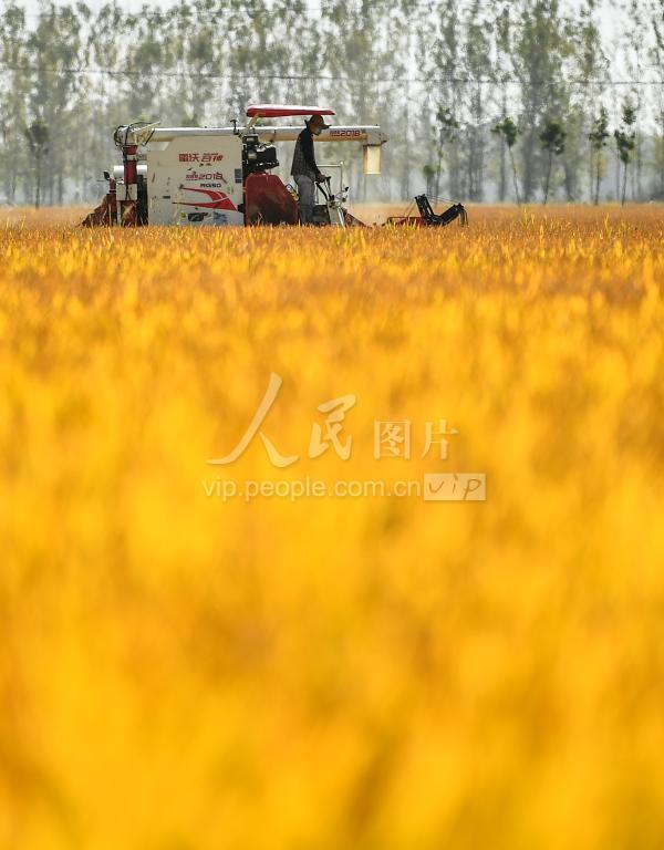 10月22日,在山东省枣庄市台儿庄区邳庄镇,收割机在收获水稻。
