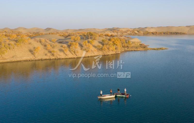 2020年10月22日,位于新疆尉犁县境内的罗布湖,游人在湖中垂钓。