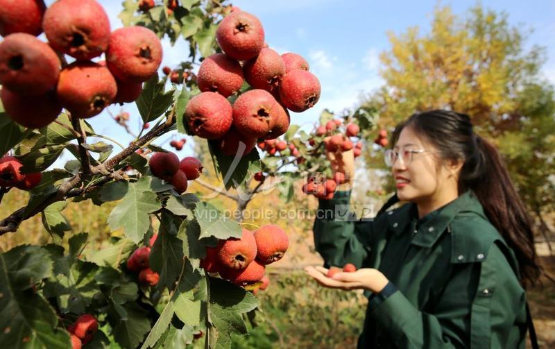 2020年10月28日,山东省东营市东营区万野农作物种植农民专业合作社种植基地,游客在采摘山楂。东营区积极推进农业产业和乡村旅游融合发展,聚力打造以旅游观光、休闲度假和农事体验于一体的特色休闲观光农业,通过举办“葡乡慢境·休闲六户”生活节、“生态六户”农产品展销会、史口荷花龙虾节、邵桥捕鱼节等节庆活动,带动农业增效、农民增收,助推乡村振兴。