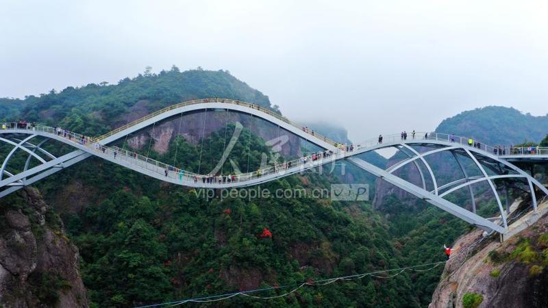 2020年10月17日,众多游客在浙江省台州市仙居县神仙居景区“如意桥”上拍照、游玩。该“如意桥”今年国庆期间正式开放,刚柔并济的造型与神仙居的自然风光完美地融为一体,宛如一柄空中的玉如意,吸引众多游客来打卡。