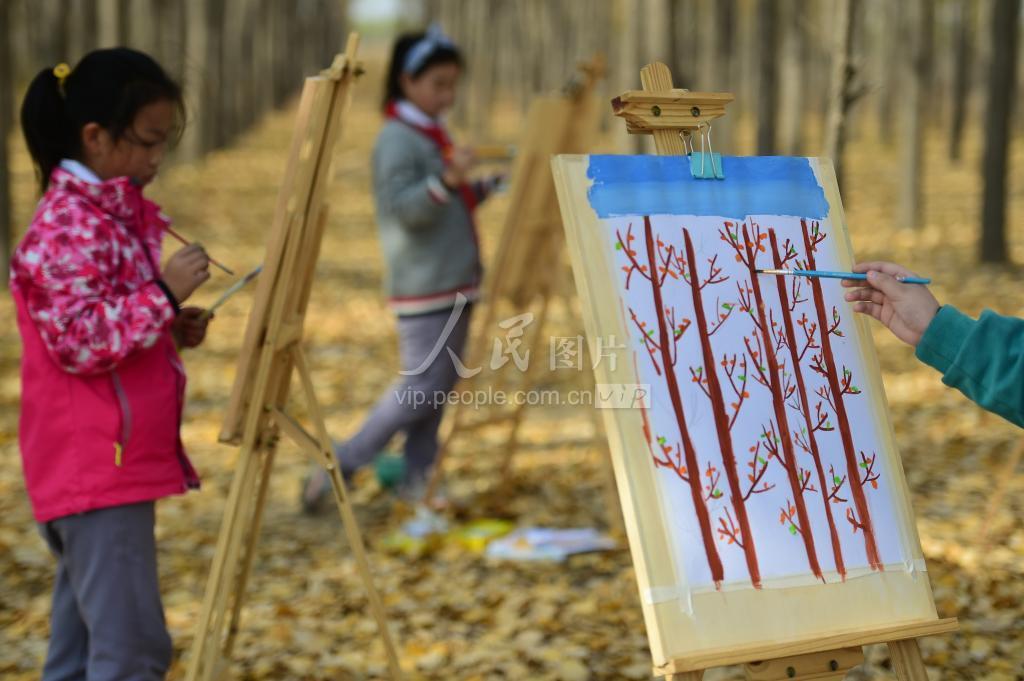 深秋时节,河北沧州郊区林地层林尽染,美不胜收。沧州实验小学的学生在老师带领下走出教室,以“多彩森林”为主题,用画笔描绘斑斓秋色。