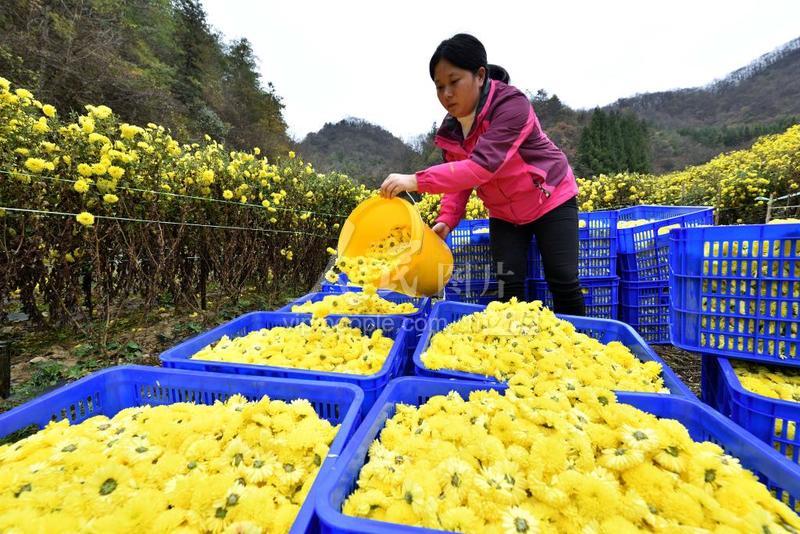 深秋时节,湖北省襄阳市保康县马桥镇尧治河村菊花种植基地的各类菊花进入采摘期,村民们忙着采摘、分拣、烘干菊花,供应市场。 近年来,保康县发挥独特的地理环境和气候优势,采取“公司+合作社+农户”方式,发展观赏性强、经济价值高的菊花种植,把菊花加工成茶饮、药材等高附加值产品,带动当地农民增收致富。