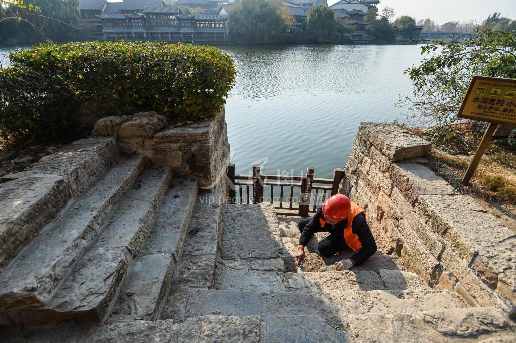 11月10日,在京杭大运河山东台儿庄古运河段,施工人员对一处古码头进行修缮。