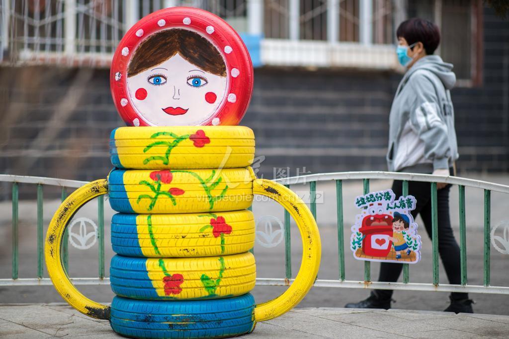 2020年11月17日,市民从内蒙古呼和浩特市玉泉区小召前街街道办事处垃圾分类主题广场旁经过。