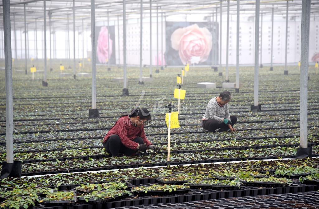 2020年11月17日,在河北省邯郸市肥乡区南西落堡村花卉苗木基地,农民在月季大棚中劳作。