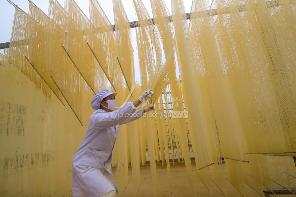 2020年11月18日,河南省信阳市光山县十里镇杨湾村刘保华油条挂面作坊,村民正在晾晒传统手工油条挂面。该作坊实行统一工序、统一包装、统一商标,产品通过电商销往全国各地,并吸纳了村里65名村民在家门口就业。