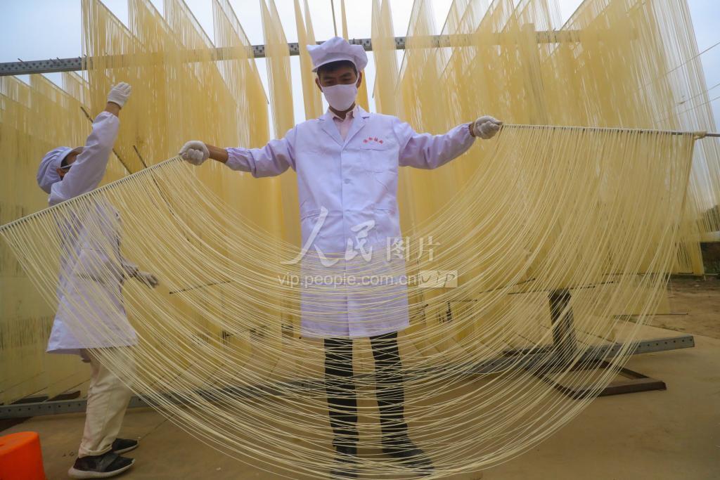2020年11月18日,河南省信阳市光山县十里镇杨湾村刘保华油条挂面作坊,村民正在晾晒传统手工油条挂面。该作坊实行统一工序、统一包装、统一商标,产品通过电商销往全国各地,并吸纳了村里65名村民在家门口就业。