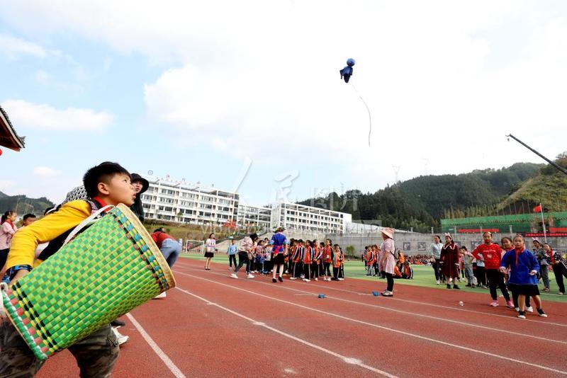 2020年11月18日,学生们在广西三江侗族自治县古宜镇江川小学田径场上进行背篓抛绣球比赛。