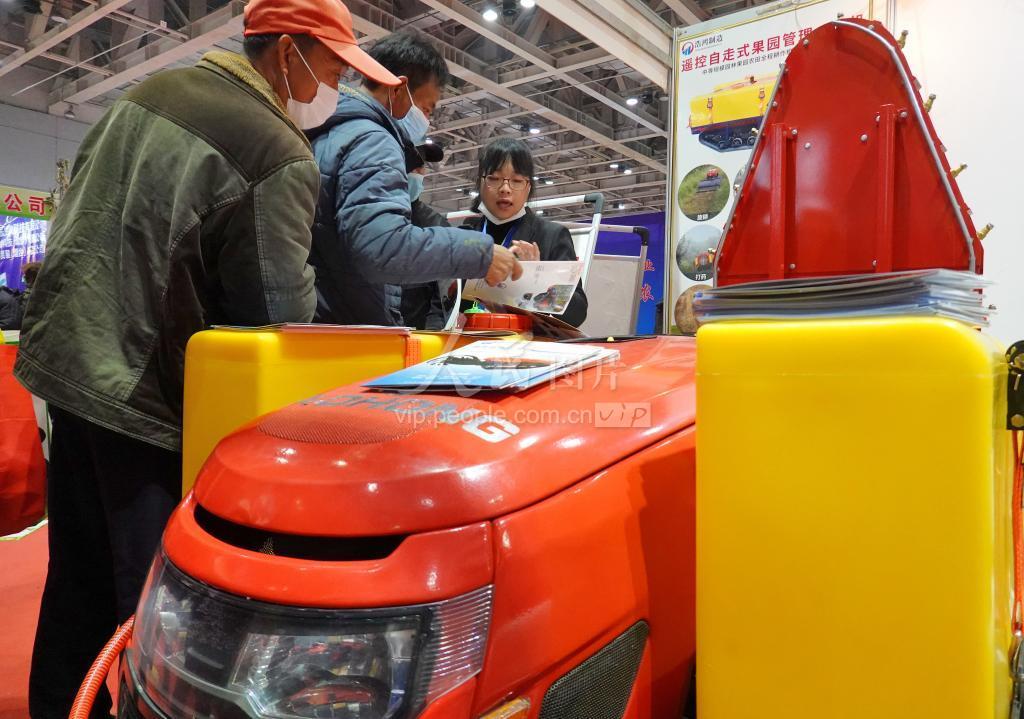 11月19日,在2020北方(烟台)果树苗木·生产资料交易会上,参展商(右)向观众介绍植保机械。