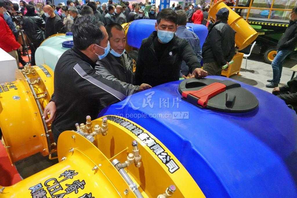 11月19日,在2020北方(烟台)果树苗木·生产资料交易会上,参展商(右)向观众介绍植保机械。