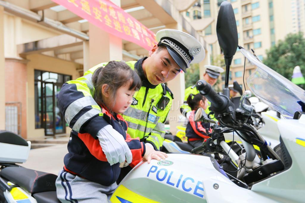 图为民警根据幼儿园小朋友活泼好动的性格特点,让他们亲身体验交警铁骑装备。