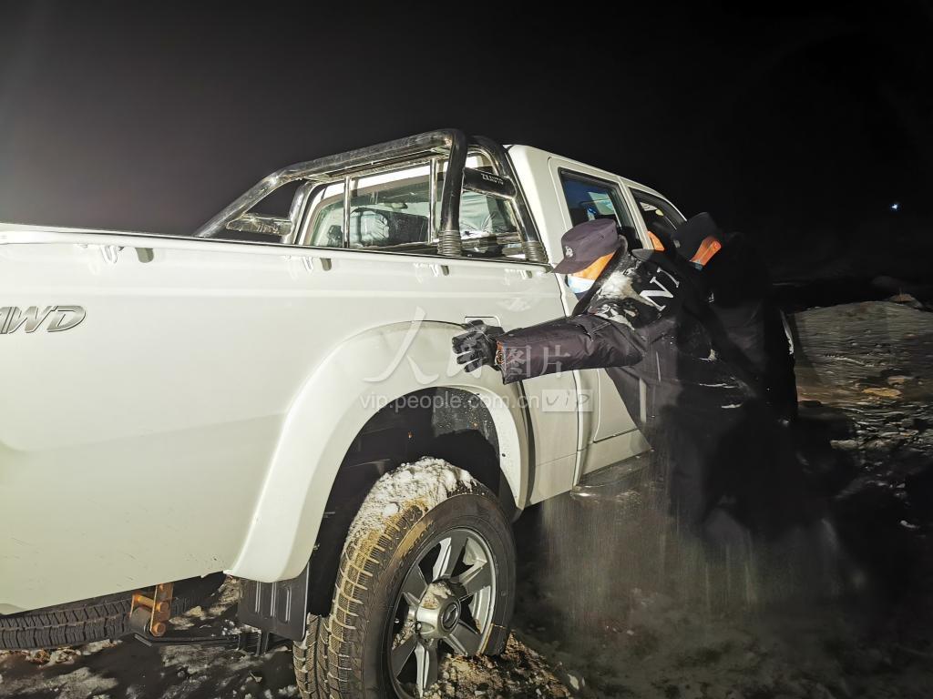 2020年11月19日晚,新疆阿勒泰边境管理支队阿热勒边境派出所民警正在帮助滑下路基车辆脱困。