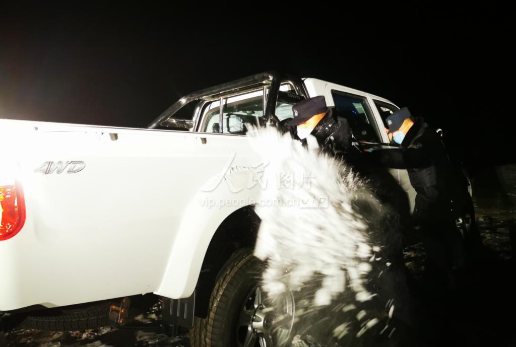 2020年11月19日晚,新疆阿勒泰边境管理支队阿热勒边境派出所民警正在帮助滑下路基车辆脱困。