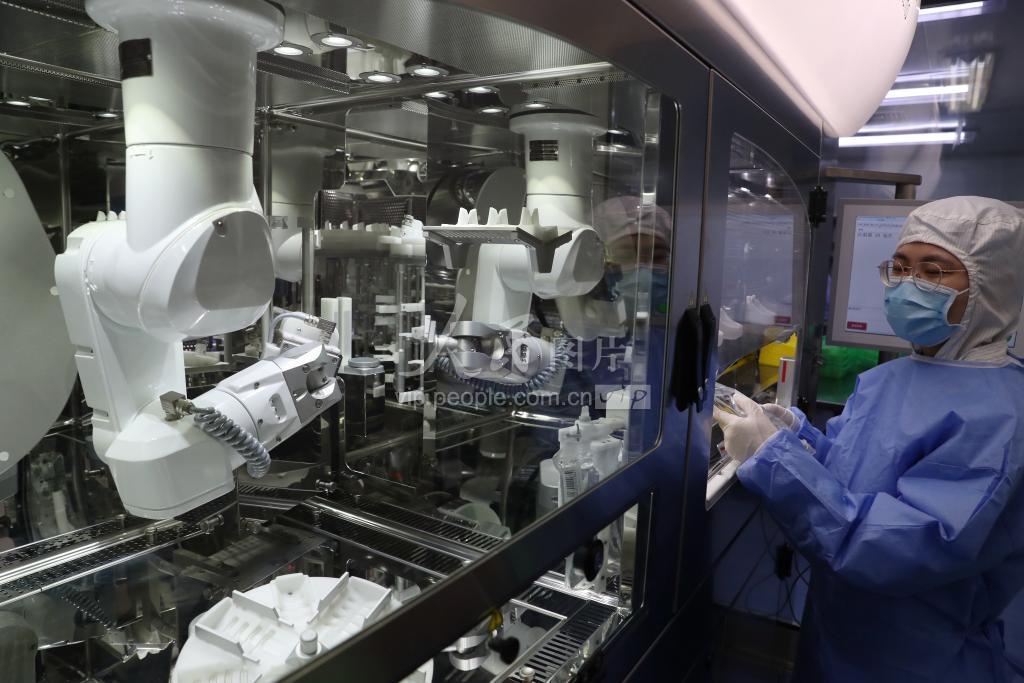 2020年11月18日,安徽省肿瘤医院静脉药物配置中心,医护人员在观察配药机器人运行状况。