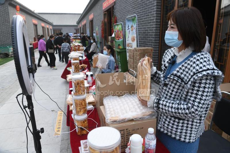 2020年11月16日,在安徽省阜阳市临泉县长官杂技小镇上,展销人员利用手机进行特色农产品展销直播。