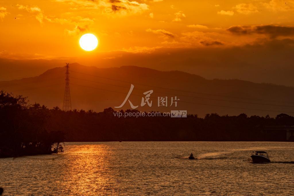上传时间: 2020-11-21 21:21:03 图片说明: 2020年11月21日,海南琼海,市民驾驶游艇在夕阳下的万泉河上冲浪。