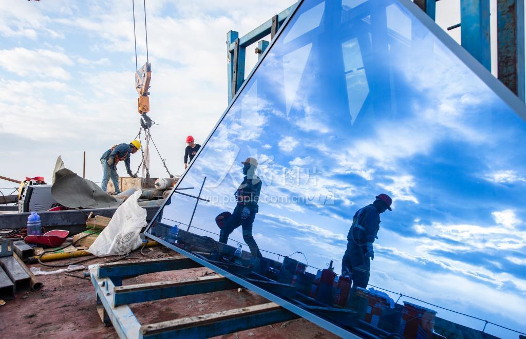 2020年11月21日,在广西梧州市白云山景区的西江明珠塔项目建设现场,工人们上下配合组装幕墙。