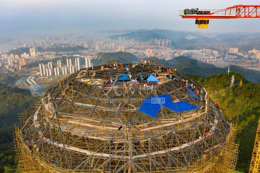 2020年11月21日,在广西梧州市白云山景区的西江明珠塔项目建设现场,塔顶“宝石”造型上部已经显现。