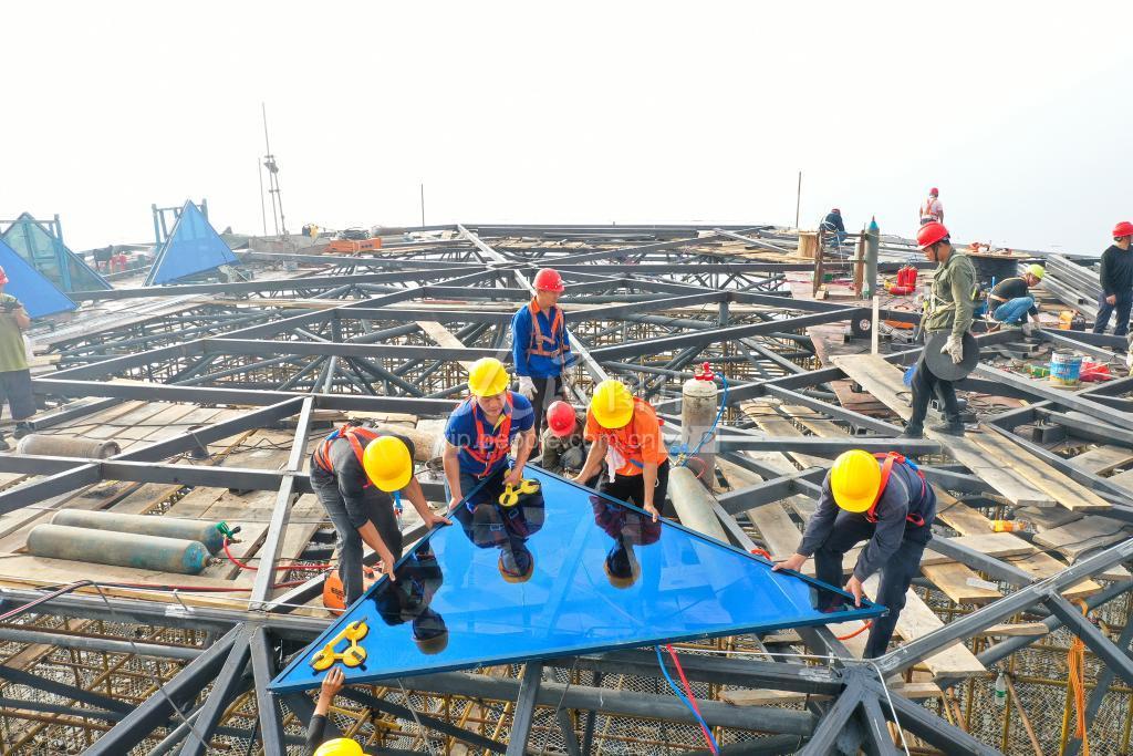2020年11月21日,在广西梧州市白云山景区的西江明珠塔项目建设现场,塔顶“宝石”造型上部已经显现。施工建设单位趁着晴好天气,工人们日夜分班作业,连续奋战对西江明珠塔塔顶“宝石”造型进行玻璃幕墙施工,预计于12月2日全部完工,12月5日亮灯。西江明珠塔是该市旅游品牌中的“三塔”之一,建成后将成为广西梧州新一处网红打卡点,也是该市旅游标志性建筑。