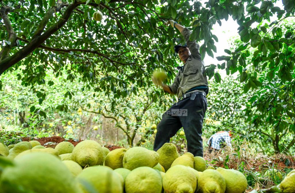 2020年11月22日,湖南省永州市道县梅花镇赤源村三和生态农庄柚子种植基地,村民在采收柚子。
