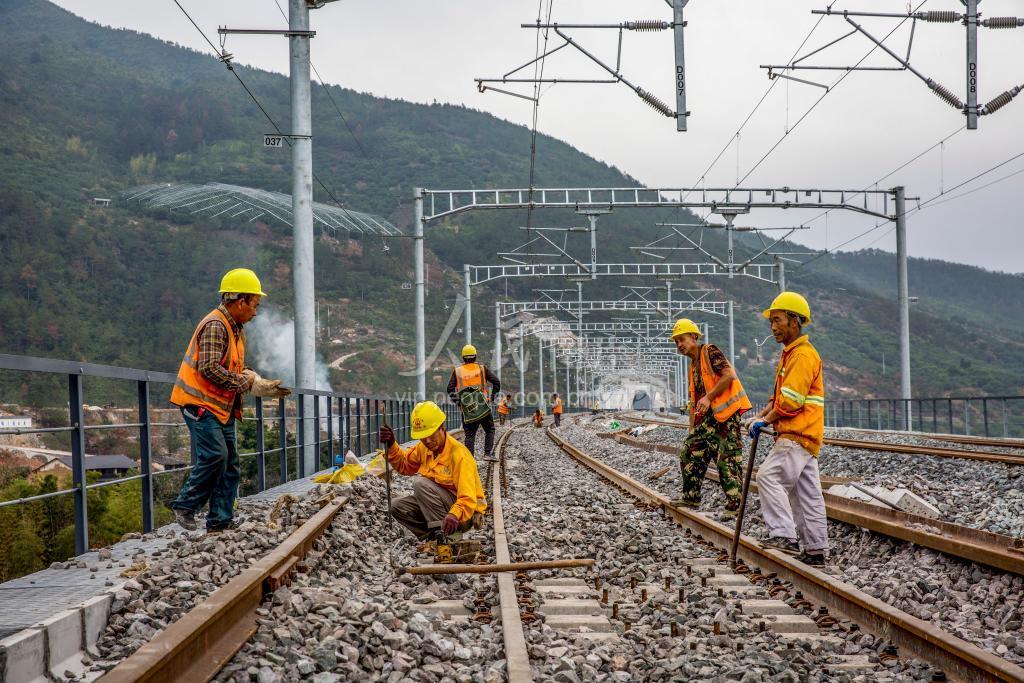 2020年11月21日,铁路建设者在金台铁路台州市仙居县白塔镇岙里段优化铁轨作业。