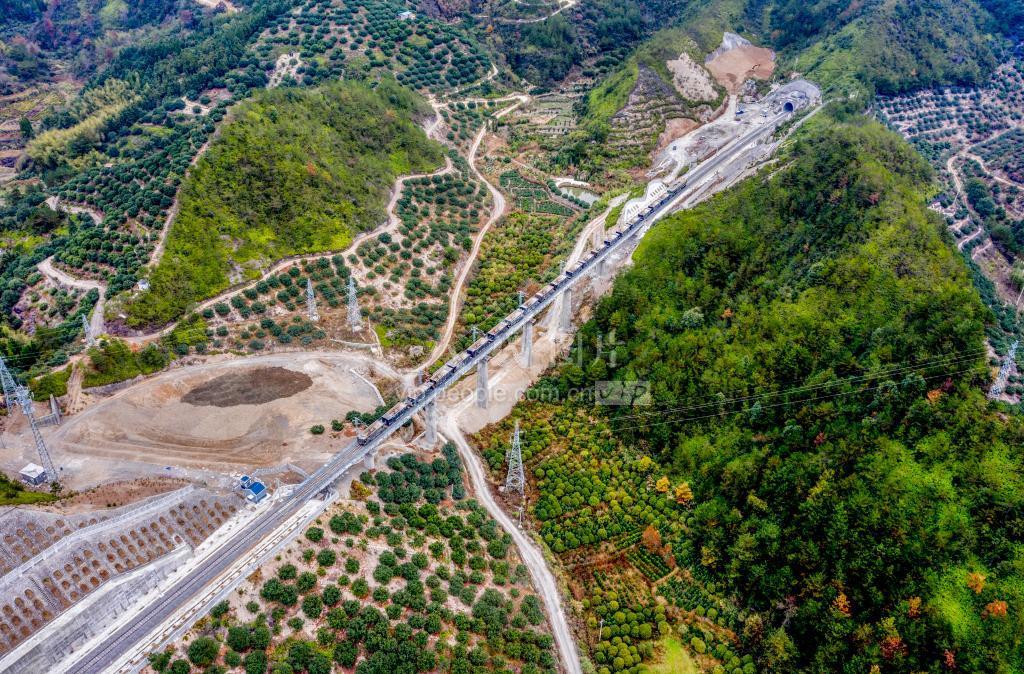 2020年11月21日,航拍金台铁路台州市仙居县白塔镇岙里段,火车在区间运送工程材料。