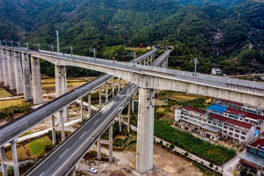 2020年11月21日,航拍台州市仙居县横溪镇里林段,金台铁路与诸永高速公路交叉,形成一个立体交通网。