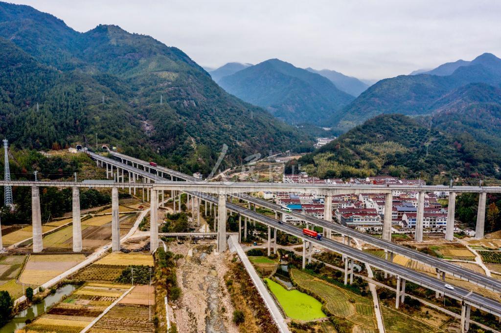 2020年11月21日,航拍台州市仙居县横溪镇里林段,金台铁路与诸永高速公路交叉,形成一个立体交通网。