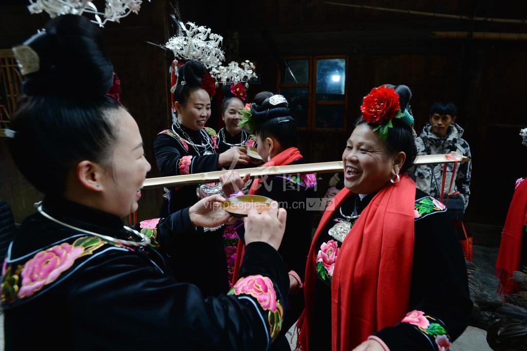 2020年11月22日,贵州省雷山县丹江镇水电村排卡苗寨外嫁的100多名身着节日盛装的妇女和丈夫一起挑着鸡、鸭、鱼、米酒和猪等礼物,携带孩子邀约在山下村口集中,集体回娘家过苗年。排卡苗寨的娘家人摆起十二道拦门酒放起鞭炮吹起芦笙欢“姑妈”回娘家团聚过年,场面喜气热闹,洋溢着浓浓的苗族年味。