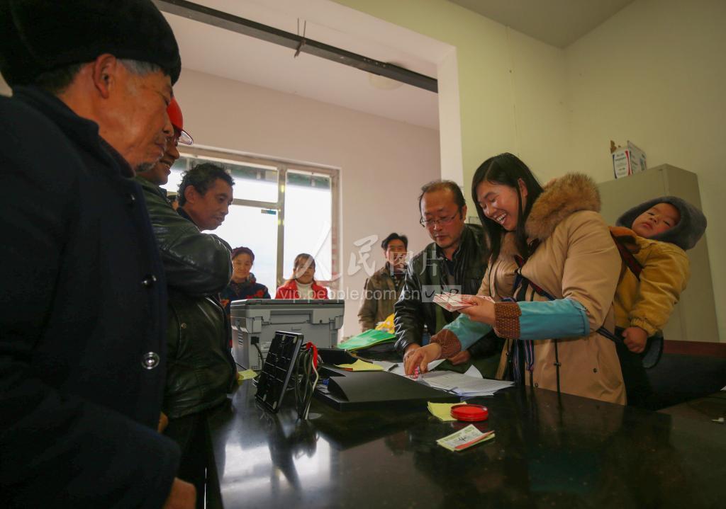 2020年12月8日,范美素(右一)在贵州省毕节市黔西县雨朵镇老君关社区,给群众发放卖高粱的款。