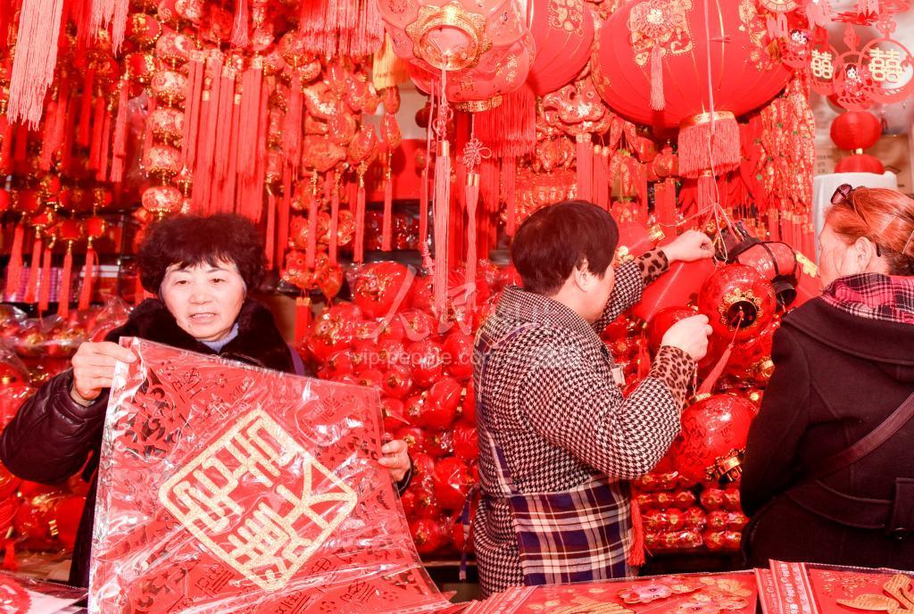 2020年12月21日,浙江省金华市新农贸市场内,不少顾客在精心挑选红灯笼等喜庆用品。元旦前夕,金华市一些大商场和超市里红红的挂饰、对联、福字贴、喜糖、灯笼等喜庆用品摆满了货架,吸引许多市民来挑选购买。