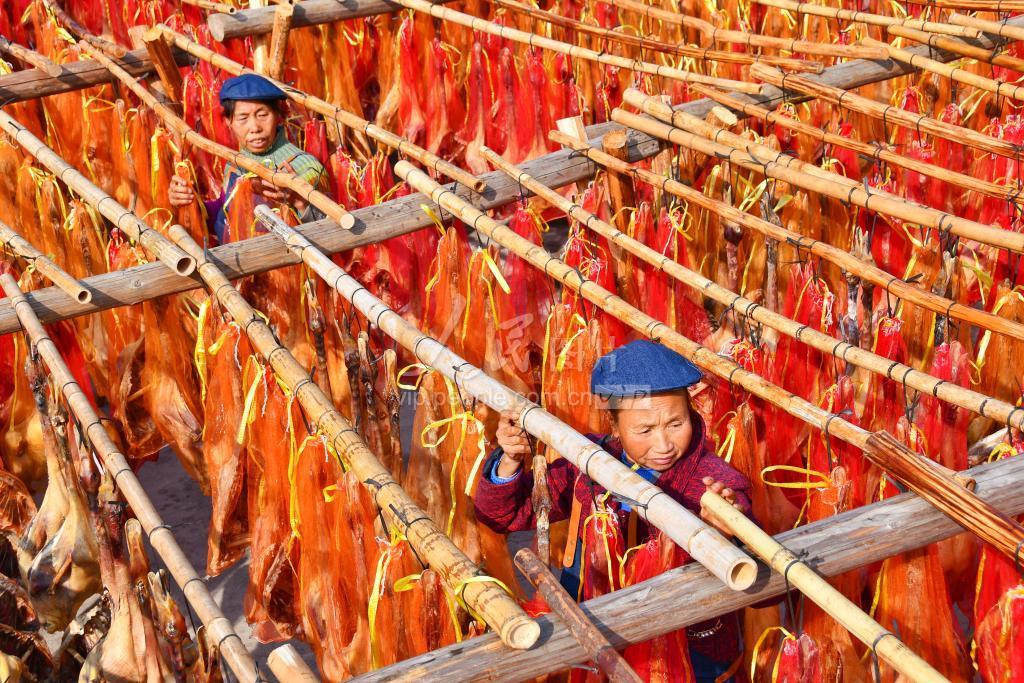 2020年12月21日,江西省赣州市兴国县枫边乡密石村村民在晾晒腊鸭。