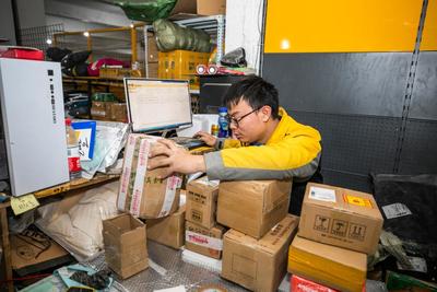 2020年12月28日,工作人员在贵州省毕节市赫章县快递联盟分拣配送中心整理包裹。