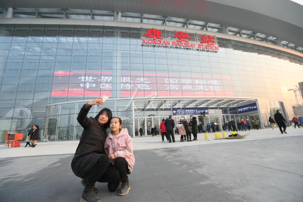 12月26日,当地居民与雄安站合影。