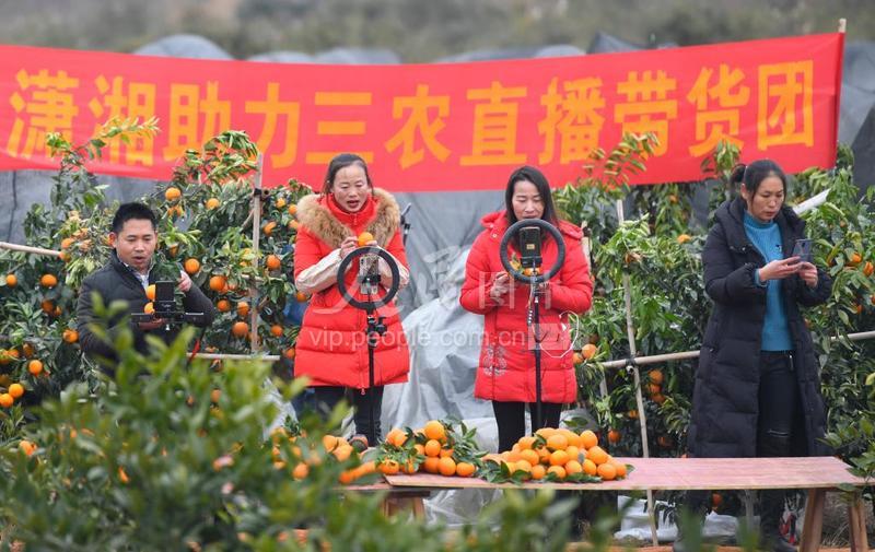 2021年1月10日,湖南道县祥霖铺镇桐油坪村明达柑橘种植园,“新农人”在直播销售沃柑。近年,湖南永州工贸学校充分发挥农村党员和青年农民培训中心的优势,大力开展品牌网销课程和直播带货实训,培养出爱农业、懂网络、善经营的“新农人”, 助力拓宽农户增收致富渠道。
