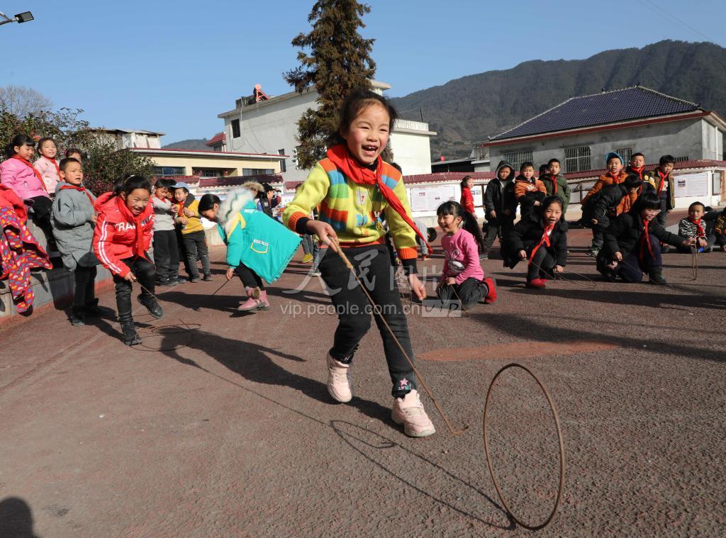 2021年1月13日,湖南省保靖县野竹坪小学的学生在操场上玩滚铁环游戏。入冬以来,该校利用体育课和大课间,组织学生开展踩高脚马、跳竹竿舞、滚铁环等民族传统体育趣味游戏活动,让学生们在锻炼身体、体验快乐运动的同时,感受传统体育游戏的魅力。