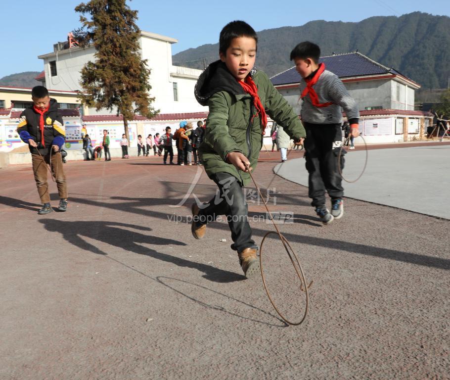 2021年1月13日,湖南省保靖县野竹坪小学的学生在操场上玩滚铁环游戏。入冬以来,该校利用体育课和大课间,组织学生开展踩高脚马、跳竹竿舞、滚铁环等民族传统体育趣味游戏活动,让学生们在锻炼身体、体验快乐运动的同时,感受传统体育游戏的魅力。